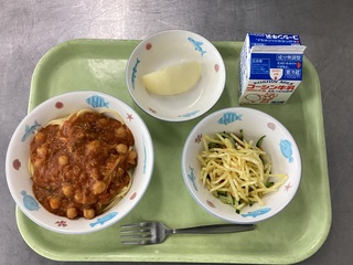 スパゲティひよこまめのソース じゃがいものハニーサラダ りんご(シナノスイート) 牛乳