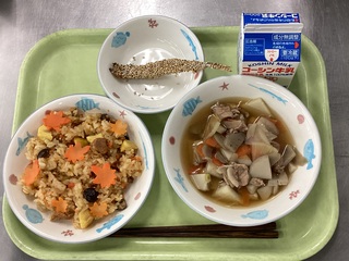 あきのやまじごはん ししゃものごまやき いもこじる 牛乳