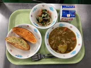 にしょくガーリックフランスパン あきのカレーシチュー かいそうサラダ 牛乳