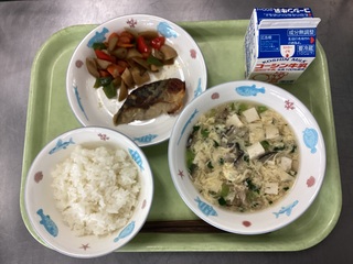 ごはん さばのしおこうじやき いろどりきんぴら きのこのかきたまじる 牛乳