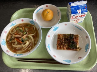 きつねうどん おこのみやき みかん 牛乳