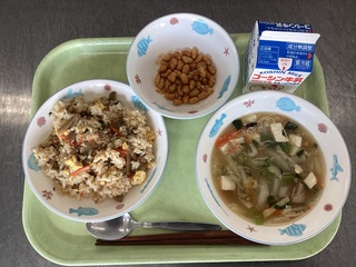 ごぼういりチャーハン スパイシーまめ ごもくスープ 牛乳