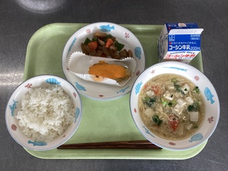 ごはん たらのもみじやき いろどりきんぴら かきたまじる 牛乳