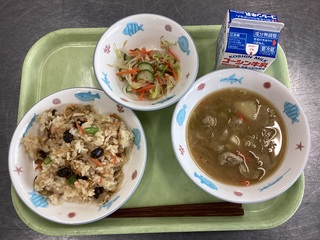 くろだいずいりおこわ やさいのゆずソースかけ あじのつみれじる 牛乳