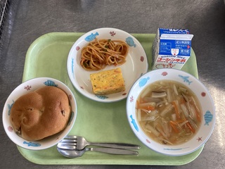 ぶどうパン ポテトオムレツ スパゲティソテー はくさいスープ 牛乳
