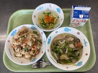ちゅうかおこわ キャロットソースサラダ はくさいとにくだんごのスープ 牛乳