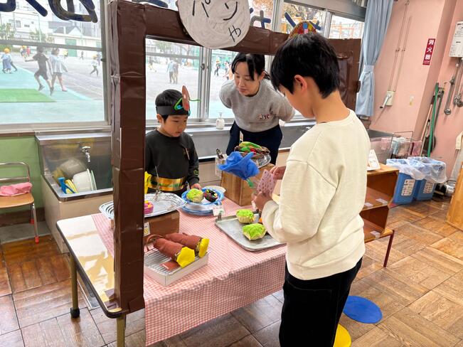 5年2組が菊川幼稚園の子供たちと交流をしました。幼稚園のお祭りに招待していただき、屋台を楽しんだり、迷路で遊んだりしました。