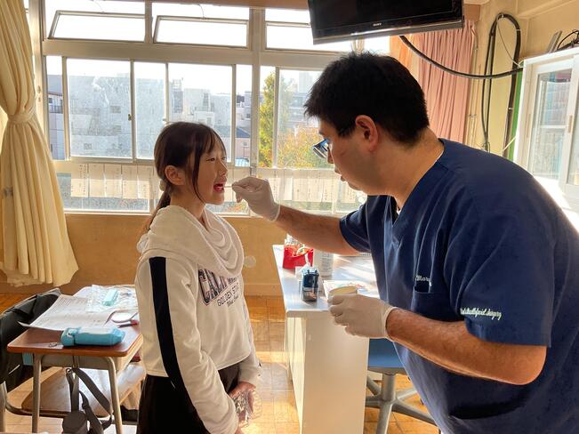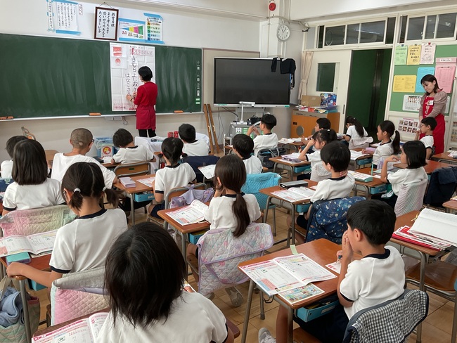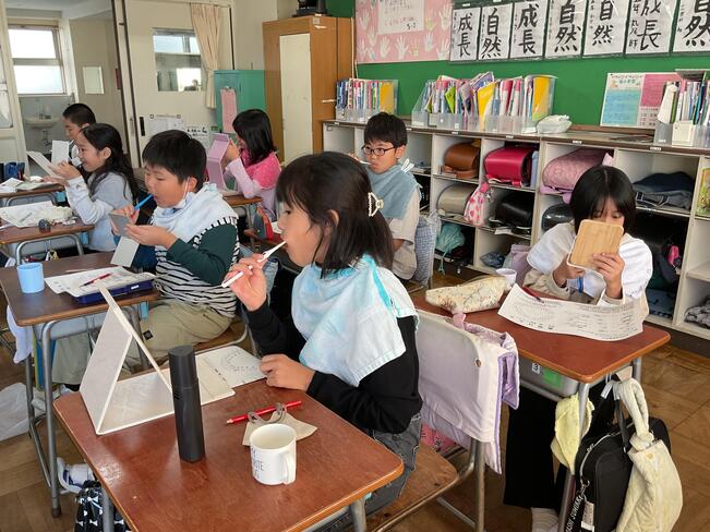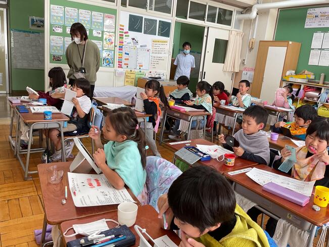 学校歯科医の丸山先生を講師にお招きし、1年生と5年生が正しい歯の磨き方について学びました。歯みがきの時間の目安は3〜5分だそうです。ぜひ、ご家庭で好きな音楽を一曲かけながらお子様と一緒に歯みがき時間を楽しんでみてください。