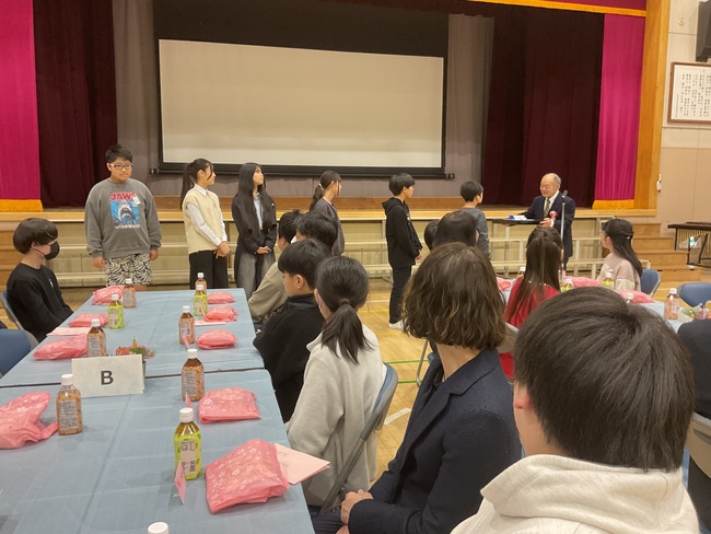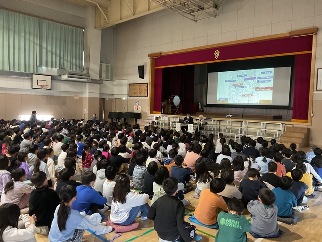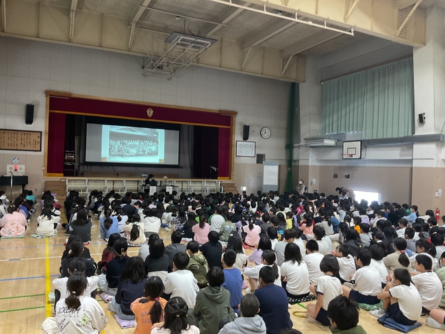 集会では、戦争当時の様子や、平和の尊さについてのお話を聞きました。全校児童が体育館に一堂に会する中、子どもたちは静かに、そして真剣な眼差しでお話に耳を傾けていました。