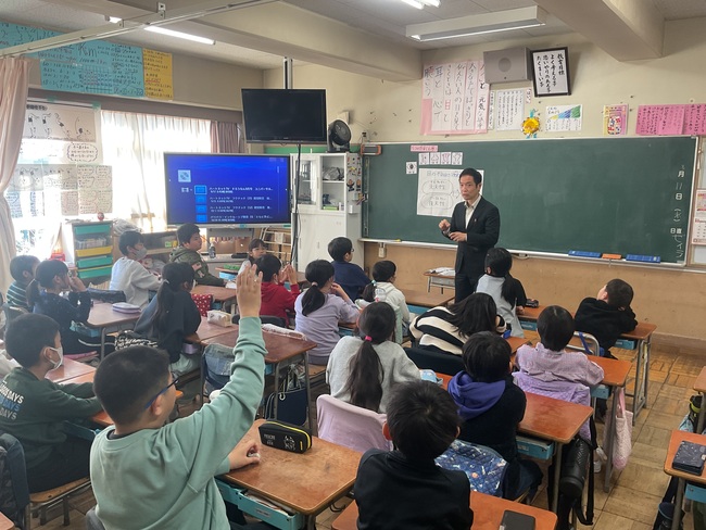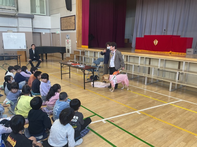 福祉教育の出前授業を行いました。今回は、視覚に障害のある方と、大切なパートナーである盲導犬をお招きし、貴重なお話を伺いました。授業では、目の見えない・見えにくい日常生活の中で工夫されていることや、街中で困ってしまうことについて、当事者の方から直接お話をお聞きしました。子供たちは、自分たちの普段の生活と重ね合わせながら、お話に聞き入っていました。