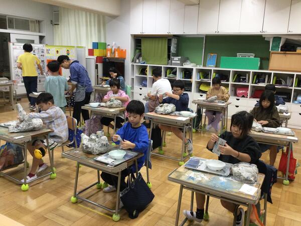 展覧会に向けて、お面作りをしています。新聞紙を1枚ずつ丁寧に貼り、その上からさらに障子紙を貼りました。みんな集中して取り組みました。