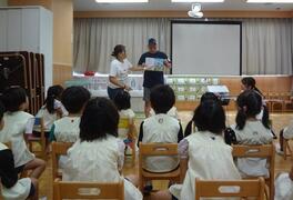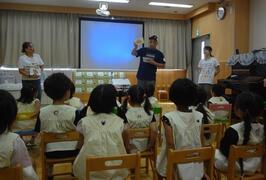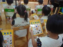 今月は、クレヨン・本・帽子など、保育室にあるものに関する単語を教えてもらいました。