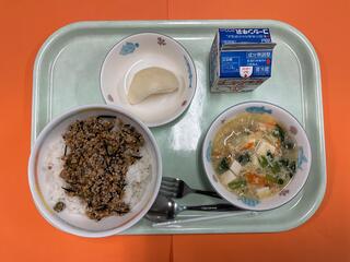 9/5 鶏肉と野菜のそぼろ丼 かきたま汁 くだもの(なし) 牛乳