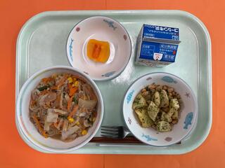 9/26 味噌ラーメン じゃが芋と大豆のいそべ揚げ くだもの(柿) 牛乳