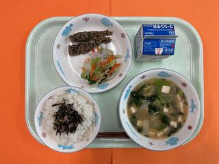 10/7 ごはん ひじきとツナの佃煮 めひかりのごま揚げ マロニーのからしあえ みそ汁 牛乳