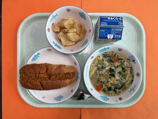 10/15 焼きカレーパン じゃがみそサラダ 野菜スープ 牛乳
