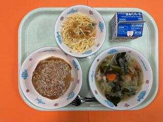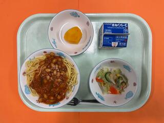 10/16 スパゲティビーンズソース コーンサラダ くだもの(柿) 牛乳