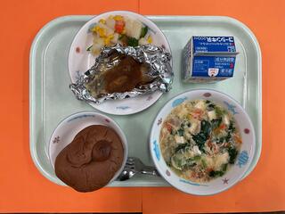 10/23 ココアパン 魚のバーベキューソースがけ マセドアンサラダ 豆腐と卵のスープ 牛乳