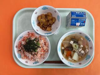 10/30 石狩ごはん 大豆とさつまいものあげ煮 けんちん汁 牛乳