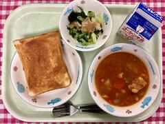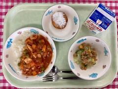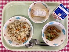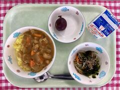 今日は人気のカレーライスに、たっぷりのひよこ豆を加えてかみ応えのあるカレーライスでした。ルーがたっぷりだったので、ご飯もたくさん食べられたと思います。果物のプルーンはとっても久しぶりに給食に登場しました。ドライプルーンは有名ですが、生のプルーンはなかなか食べる機会がすくないですよね。初めて食べる人も多く、少し戸惑いながらも一生懸命食べていました。
