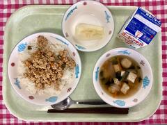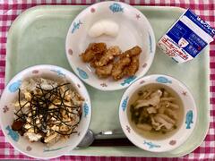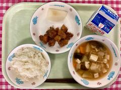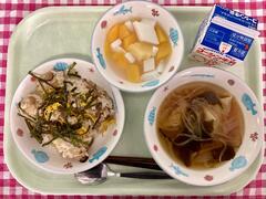今日は鉄分豊富な高野豆腐をお肉とお合わせてご飯に合うおかずに仕上げました。にんじんや椎茸などもみじん切りにして混ぜてあるので野菜も一緒に食べられます。そして今年度初めてのりんごは「つがる」という品種でした。シャキシャキ食感でおいしいりんごをみなさん堪能していました!