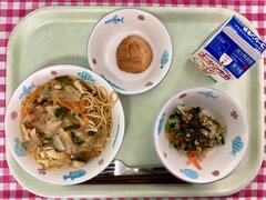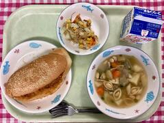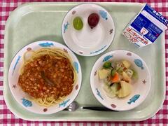 今日はレンズ豆がたっぷり入ったミートソーススパゲッティです。レンズ豆は小さいので、豆が苦手な人も食べられる人が多いです。みなさんフォークを上手に使ってくるくると巻いて食べていました。そして2種類のぶどうは給食で出る機会も少ないので、おかわりじゃんけんがどのクラスも白熱していて、大人気でした。