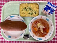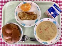 今日はお魚にハーブとパン粉をまぶしてカリッと焼き上げました。お魚が苦手な1年生も多かったですが、おいしすぎる!と感想を教えてくれる子もいました。また、じゃがいもでとろみをつけたポタージュも人気がありました。珍しい国産のバレンシアオレンジは皮が柔らかくて食べやすかったです。