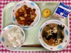 今日は年に数回しか登場しない酢豚を作りました。お肉とじゃがいもを油で揚げたものにたっぷりの野菜とソースが絡みます。ご飯に良く合う味付けで、特に中学年から高学年の児童のみなさんに人気でした。極早生みかんは小さいながらも、爽やかな味わいがしました!