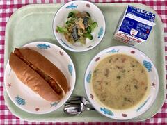 今日はパンの間に具をたっぷり詰めてチーズをのせて焼きました。大豆を細かくしたものやピーマンも入っていますが、ピザの味付けなので、大人気でした。学級閉鎖で余ってしまったパンもたくさん食べてくれました!グリーンサラダは練りごまを使用したドレッシングで、とても人気があります。