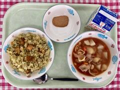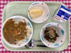 今日はいつものカレーにイカ・エビ・ひじきのシーフードをたっぷり入れました。魚介のうまみがたっぷり含まれています。学級閉鎖もあり、ルーが少し多めでしたがご飯にたっぷりかけて食べてくれていました。りんごはサクッとっした食感でとてもおいしいリンゴでした!