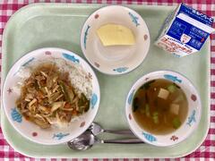 今日はうまみたっぷりのチンジャオロースがごはんにのった丼ぶりでした。お肉もお野菜もたっぷりとることができます。今日は1年生から6年生までよく食べていて、残しはほとんどありませんでした。今日のりんごはりんごの王様と言われているサンふじです。シャキシャキのおいしいりんごを味わって食べていました。