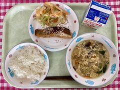今日はお魚が人気でした。低学年〜高学年にかけて辛さを調節して味付けをして焼いたお魚は、ご飯がとても進む味付けです。リクエストでもらったきのこのかきたま汁はきのこ嫌いも多い中、人気のあるメニューでもあります。卵がふわふわなのがポイントです。