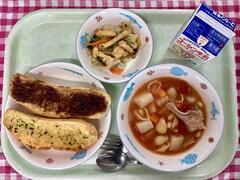 今日の2色フランスパンが「いつもと色が違う!」と子供たちは驚いていました。いつもはパセリとパプリカパウダーの2色のガーリックトーストですが、今回は甘い味としょっぱい味が両方楽しめるようにココアシュガートーストとパセリのガーリックトーストにしました。どちらが好きか、いろいろな意見を聞くことができました。今日はどのクラスも残菜がほぼありませんでした!
