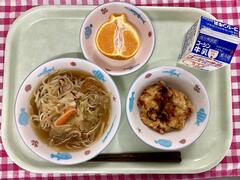 今日は子供たちがとても楽しみにしていた献立でした。ラーメンは全学年から人気があります。たこぺったんは大田区発祥の給食メニューで、三吾小の特に高学年にも人気があります。たこが入っているので噛み応えもあり、ボリューム満点です。初めて食べる1年生からもおいしい!の声が聞こえてきました。