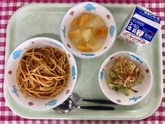 今日は6年生リクエストの第1位であったフルーツポンチと第3位だったじゃがいものハニーサラダを組み合わせた献立でした。どれも人気メニューで子供たちのテンションが上がっていました!スパゲッティはたっぷりの量あったので、おかわりを何回もしてくれていました。子供たちの口の周りが赤くなっていてとてもかわいらしい姿が見られました。
