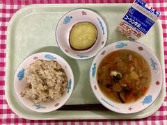 81年前の1945年の3月10日に起きた東京大空襲は第三吾嬬小がある墨田区でも大きな被害を受けました。戦争中は十分なお米が食べられずかさ増しさせたご飯や、すいとんなどの小麦粉を使った料理が多かったこと、いもやかぼちゃが多く食べられていたことを反映させた献立でした。給食の献立から、戦争について考えるきっかけになってもらえると嬉しいです。