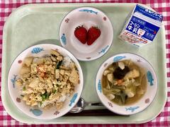 卵とじ丼にはたくさんの高野豆腐を使っています。高野豆腐は小さい物を使っているので、子供たちは抵抗感なく食べられていました。だし汁が染みてふわふわ食感です。果物のいちごは大人気で、おかわりのじゃんけんがいつにも増して盛り上がっているクラスが多くありました。