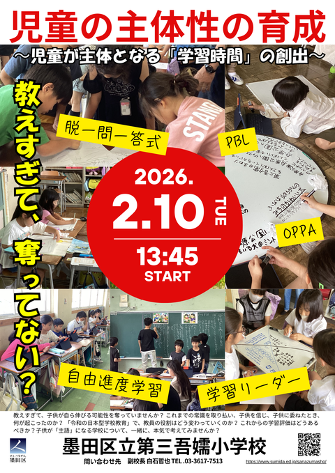 第三吾嬬小学校では、令和5年度より、令和の日本型学校・「子供が主語になる学校」づくりに向け、大胆な学校教育活動の改革に取り組んでいます。令和6年度からは、墨田区教育委員会研究協力校の指定を受け、教師が主語となる「授業」を、子供自身が主語となる「学習時間」に変換することをメインに研究を進めています。今年度は、これまでの研究の成果を広く発表するため、令和8年2月10日に研究発表会を予定しています。