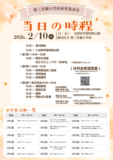 令和8年2月10日(火曜日)、全学級の学習時間公開に続き、本校体育館で研究発表会を行います。児童による質疑応答、研究推進チームの研究発表、教育委員会指導講評の後、本校の研究を支えてくださった3名の講師の先生方の講演会を分科会形式で予定しています。会場準備の関係で、事前に分科会の参加希望のアンケートを取らせていただきますので、ご理解・ご協力、よろしくお願いいたします。
