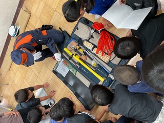 子供たちは、目の前にいる警察の方々や災害時に使う救助セットに目を輝かせながら話を聞いていました。また、積極的に質問をするなど、充実した時間を過ごすことができました。