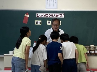 しょうゆ博士が醤油の原材料ができるまでの工程についてお話してくださいました。大豆が小麦や塩、そして麹菌を加えることで、醤油になっていくことを実物を見ながら学びました。最後には、もろみやしぼった後の醤油などの味見しました。子供たちは、初めての味に、「うわぁ!」と声をあげながら嬉しそうに味わっていました。