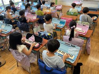 外部の先生をお呼びして、鍵盤ハーモニカの授業をしていただきました。初めて鍵盤ハーモニカに触れる児童もおり、楽しく楽器と触れ合うことができました。鍵盤の置き方、ホースの付け方、音の出し方、タンギングの仕方等丁寧に教えていただきました。これから楽しく鍵盤ハーモニカの学習を進めていきます。
