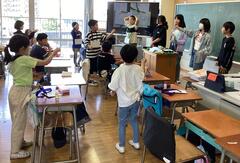 学習が本格的に始まり、外国語の学習では音に合わせて楽しく英語を発音しています。
