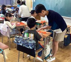 みんなペアの一年生に優しく声をかけながら、正しいやり方を伝え、一年生の記録を取っていました。