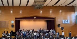 12月6日(土曜)に行われる開校20周年式典に向けて、12月1日の全校朝会で全校に合唱と合奏を披露しました。
