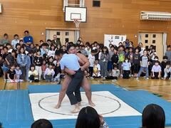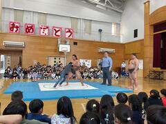 講演会の後半は力士体験ということで、四股の練習をしたり実際に取り組みをしたりしました。