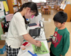 本を1冊借りるごとに1スタンプ押してもらえます。15個スタンプがたまるとプレゼントがもらえる企画です。図書室に本を借りに来る児童が増えました。