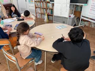 同じ時間に通級している児童同士で、展覧会のつながる国についてかいた作品を紹介し合う活動をしました。友だちの質問に答えて、生き生きとつながる国について話す姿が見られました。また、友達の国の食べ物や乗り物、着るもの、お祭りなどいろいろなことを知ることができ、楽しかったと感想を言っていました。これからも、つながる国のことをクラスの友だちにもたくさん教えてほしいと思います。
