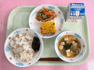 10月27日(月) 牛乳 麦入りご飯 のりの佃煮 厚焼き卵 野菜のおかか和え 大根のみそ汁