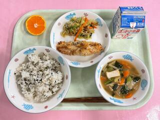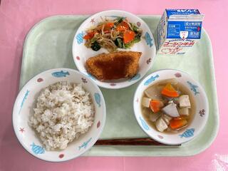 11月27日(木) 牛乳 麦入りご飯 めかじきのみそカツ 野菜のおかか和え 里芋のけんちん汁